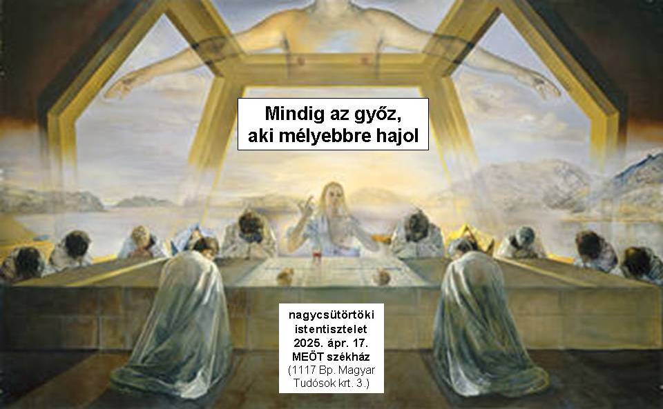 Ezen a teljesen új és egyedi liturgiájú istentiszteleten együtt vagyunk Jézussal és a tanítványaival, és szimbolikusan átéljük az általuk Nagycsütörtökön elköltött páskavacsora és Utolsó Vacsora történéseit. Miért kelt fel Jézus az Utolsó Vacsorától, és miért mosta meg a tanítványok lábait? Hogyan tisztulhatunk meg mi ma úgy, mint a tanítványok a lábmosással? Hogyan írta felül Jézus kétszeresen is a páskavacsora ősi rendjét? Miért tiltakozott Péter? Hogyan leszünk egy testvéri közösség Jézusban megélve a Nagycsütörtök misztériumát? Az istentiszteletnek az Utolsó Vacsorát szimbolikusan megjelenítő teljesen egyedi liturgiáját itt lehet meghallgatni, igehirdetése innen kezdődik el, a szövegét innen lehet elolvasásra letölteni. A következő istentisztelet április 21.-én, húsvét HÉTFŐN este 6-tól lesz gyönyörű feltámadási liturgiával és igehirdetéssel. Szeretettel várunk minden felsőoktatásban tanulót, vagy oktatót vagy oda készülő középiskolást a MEÖT székházban!
