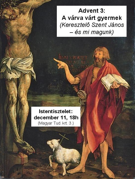 A várva várt gyermek: 3. Keresztelő Szent János -- és mi magunk. Ezzel a címmel tartottam meg a tizenharmadik egyetemi lelkészi istentiszteletemet advent harmadik vasárnapján. Az istentiszteleten Lk 1,13-17 alapján hirdettem Isten igéjét. Az igehirdetés szövegét innen lehet letölteni, illetve itt lehet meghallgatni. A következő istentisztelet (amely a négyrészes adventi, tematikus igehirdetés sorozat záró része lesz: "A várva várt gyermek: 4. Jézus -- és mi magunk" címmel) december 18-án, (Advent 4. vasárnapján) 18 órakor lesz a MEÖT székházban (Bp, XI. Magyar Tudósok körútja 3). Szeretettel várunk minden (különösen egyetemista vagy egyetemre készülő középiskolás) érdeklődőt!