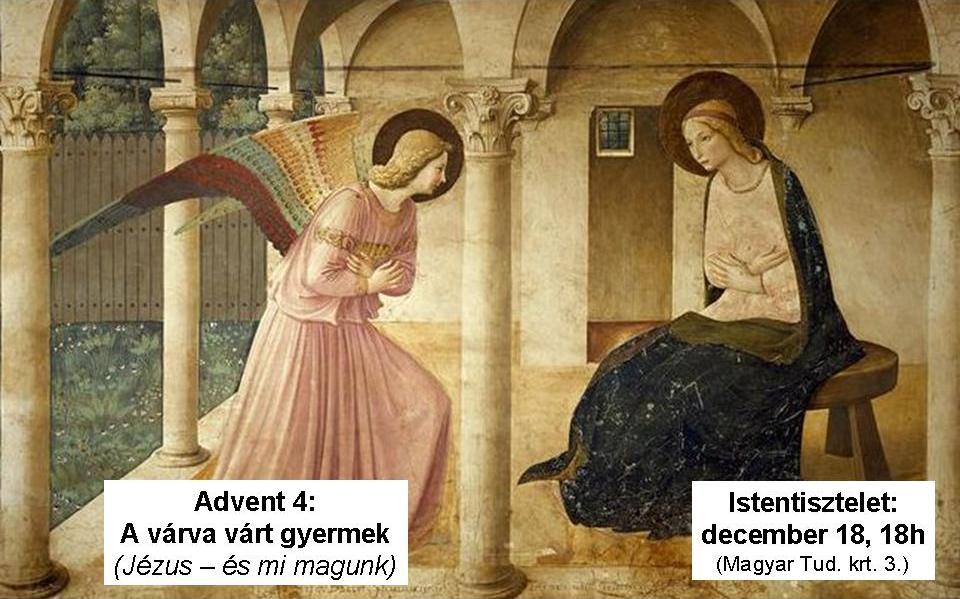 A várva várt gyermek: 4. Jézus -- és mi magunk. Ezzel a címmel tartottam meg a tizennegyedik egyetemi lelkészi istentiszteletemet advent negyedik vasárnapján. Az istentiszteleten Lk 1,30-33 alapján hirdettem Isten igéjét. Az igehirdetés szövegét innen lehet letölteni, illetve itt lehet meghallgatni. A következő istentisztelet január 1-én, újév napján (Jézus neve napján) 18 órakor lesz a MEÖT székházban (Bp, XI. Magyar Tudósok körútja 3). Szeretettel várunk minden (különösen egyetemista vagy egyetemre készülő középiskolás) érdeklődőt! Akik fel vannak iratkozva az email listánkra, december 24-én reggel megkapják a karácsonyi video-áhítat linkjét. Akik még nem, azok a csermelylelkesz@gmail.com email címen kérhetik ezt.