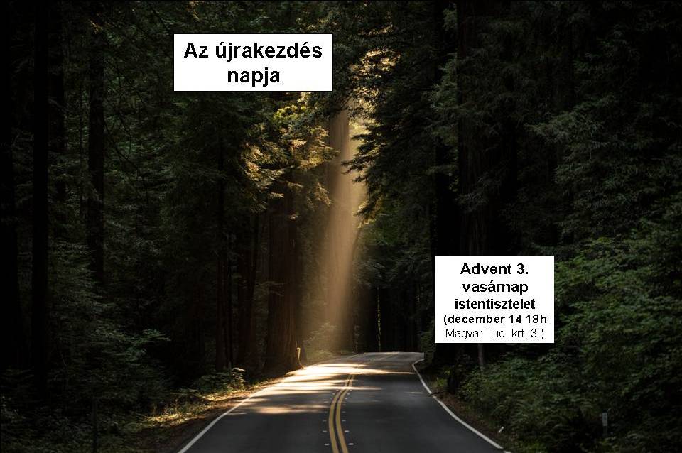 Adventben "Négy eljövetel" címmel igehirdetés sorozatot tartunk. Nov. 30: Az útrakelés napja; Dec. 7: A szabadulás napja; 3. Dec. 14: Az újrakezdés napja; Dec. 21: Jézus napja. Az eddigi adventi igehirdetéseket itt hallgathatod meg.