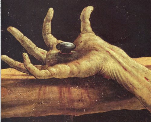(A képek Matthias Grünewald Isenheim-i oltáráról, Hans Holbein "Krisztus holtteste a sírban" című képéről és Salvador Dali "Krisztus mennybemenetele" című képéről Jézus kezét ábrázolják a nagypénteket, a nagyszombatot és húsvét feltámadását jelképezve. Figyeljük meg, ahogyan a középső képen ránk mutat Jézus halott testének nagyujja, és ahogyan csaknem ugyanaz a szöggel átütött kéz erővel telik meg Dali mennybemenetelt ábrázoló képén. Ez adhat reménységet nekünk. A szöggel átütött kéz mindig reménységgel telik meg. Mert ez az Atya akarata.)